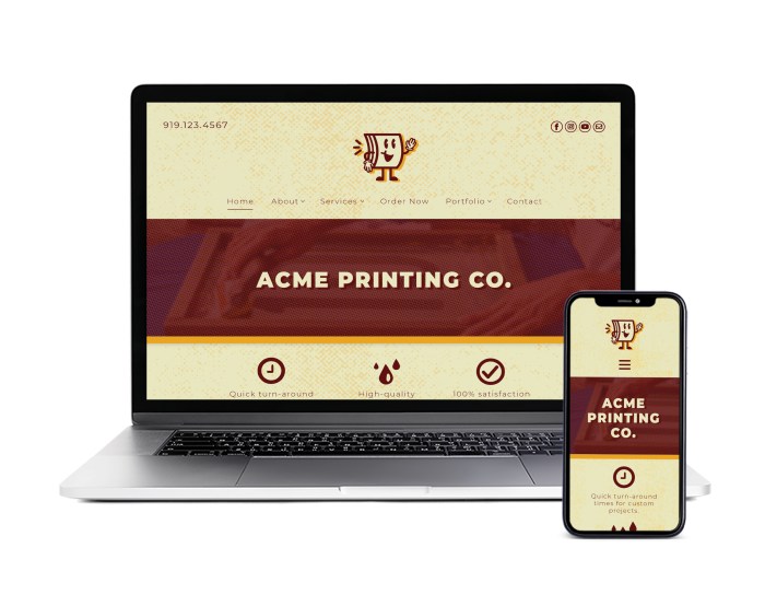I first designed a website homepage layout for the company. It features a top-level navigation bar, social icons, a large splash header image, and service feature icons. The goal of the design is for clean, simple navigation with clear company branding. The printing process can be intimidating, so the website needs to be friendly and accessible for potential customers.