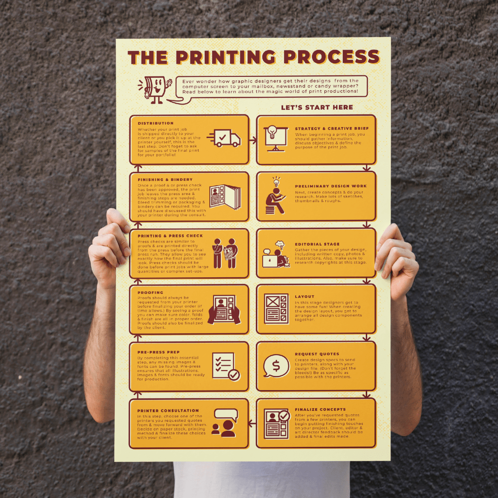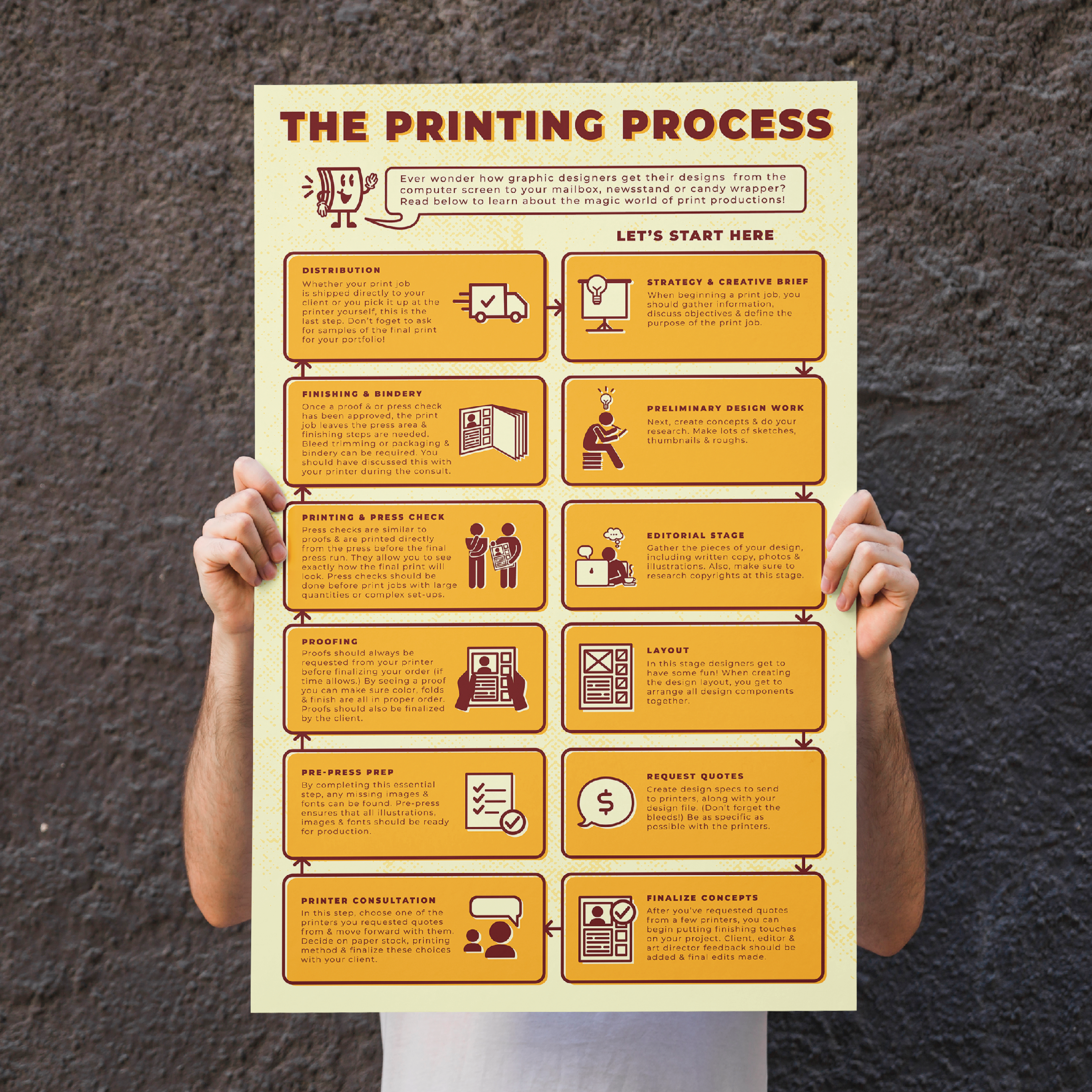 I also created an illustrated infographic poster explaining the printing process. Its purpose is to be sent as a promotional mailer to potential customers who may be unfamiliar with the printing process.