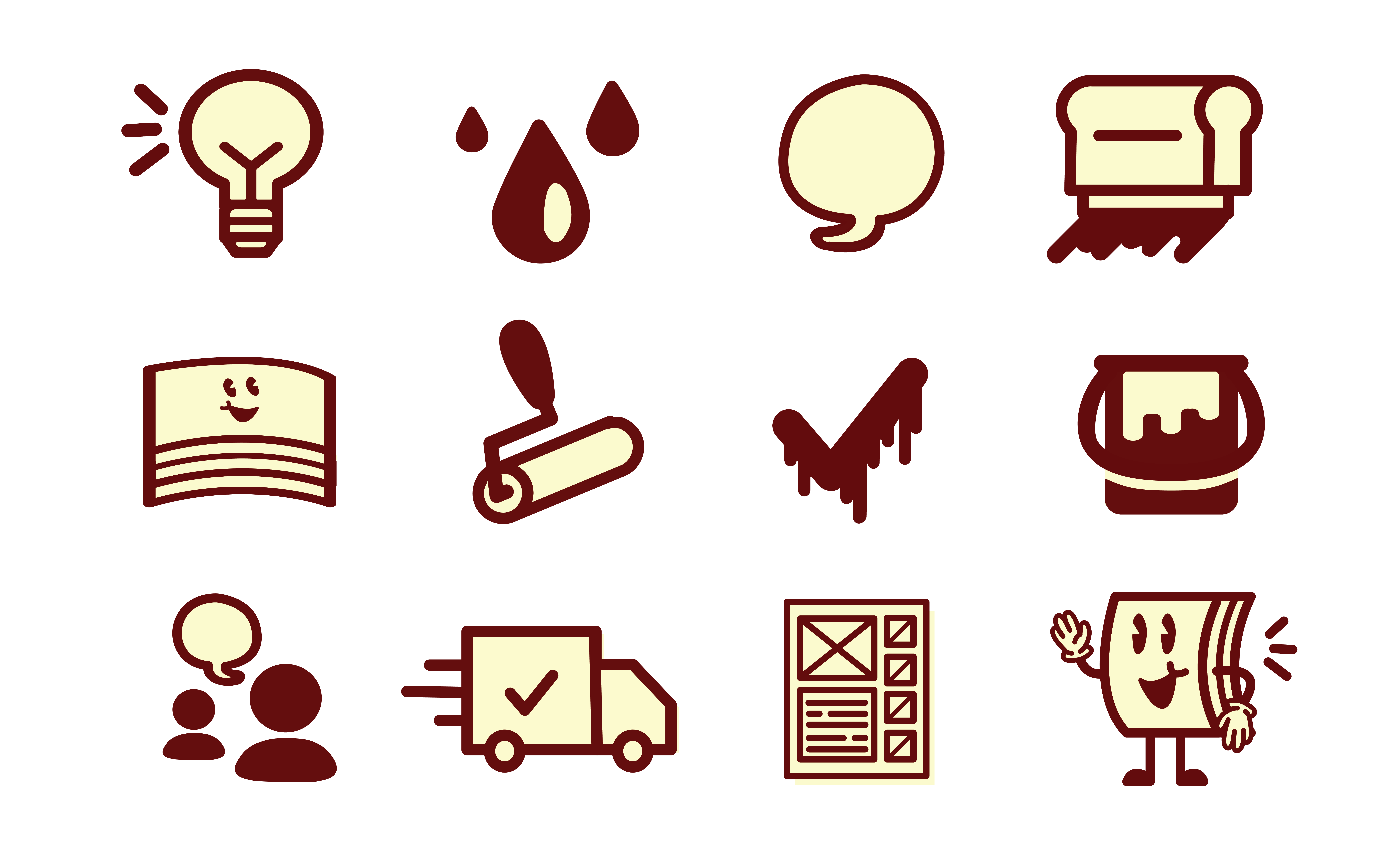 I also created a set of branded icons. I featured images of tools of the printing process as well as the mascot, Pape-y. These icons will be used throughout the company’s website, social media, and other platforms.