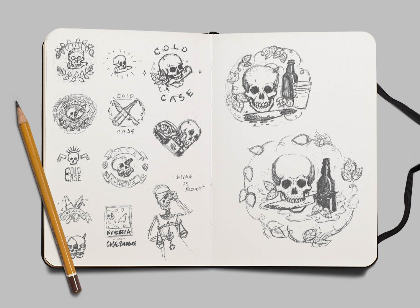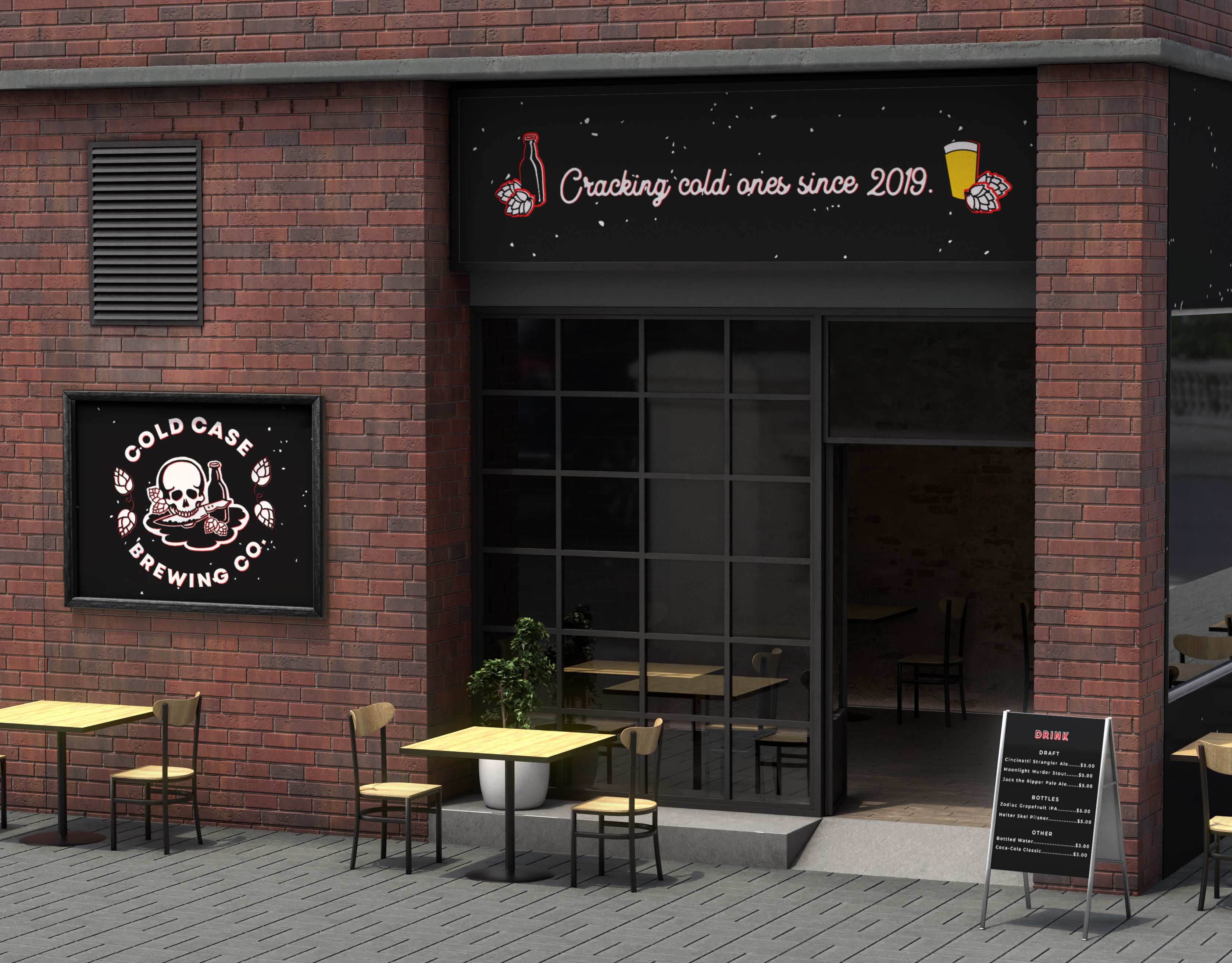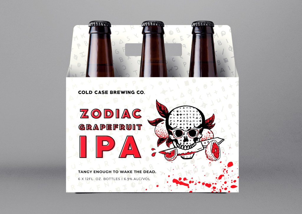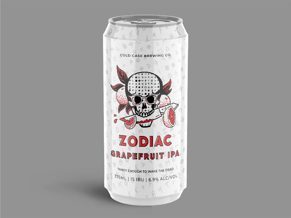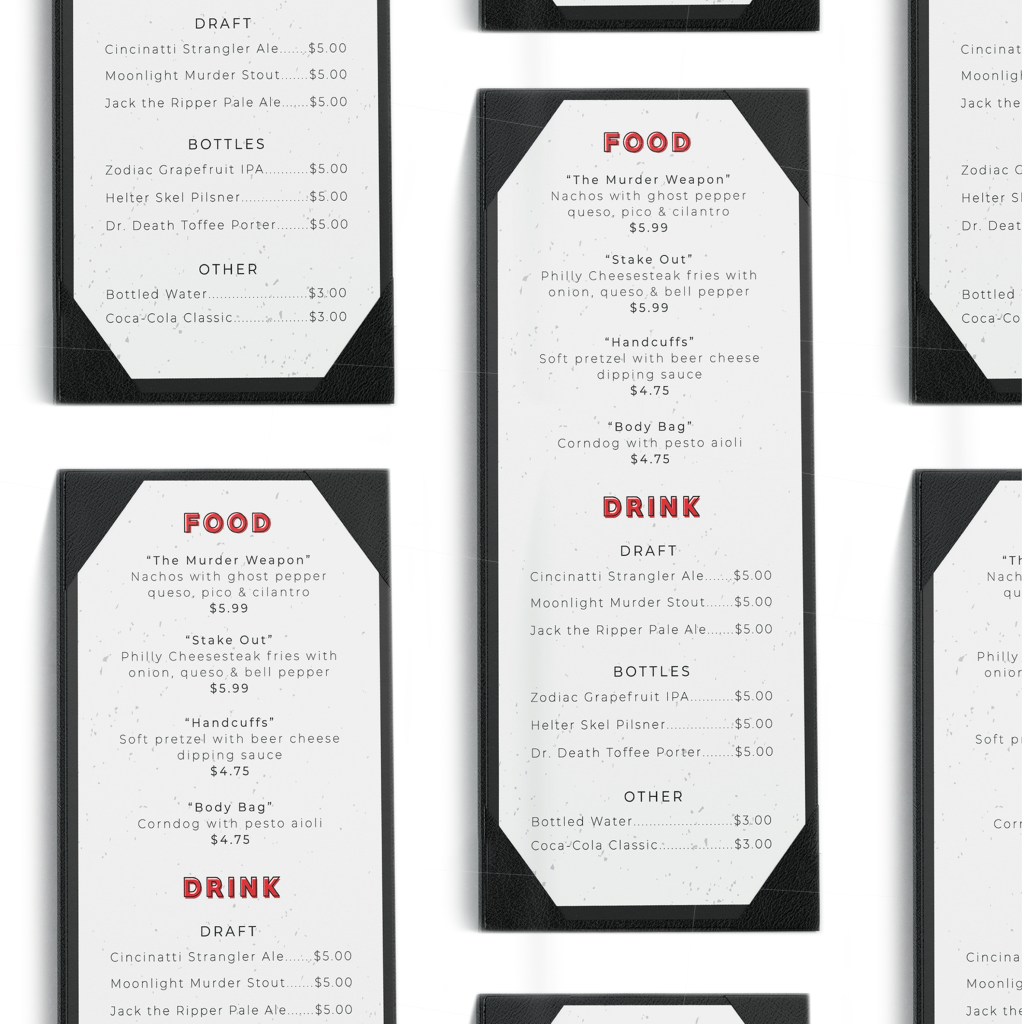 I designed a menu featuring drink names and food menu items with references to actual cold cases and serial killers. The beer packaging I designed features the Zodiac Killer, a famous unsolved cold case. A percentage of brewery sales will go towards various funds dedicated to solving cold cases, like the Cold Case Foundation.