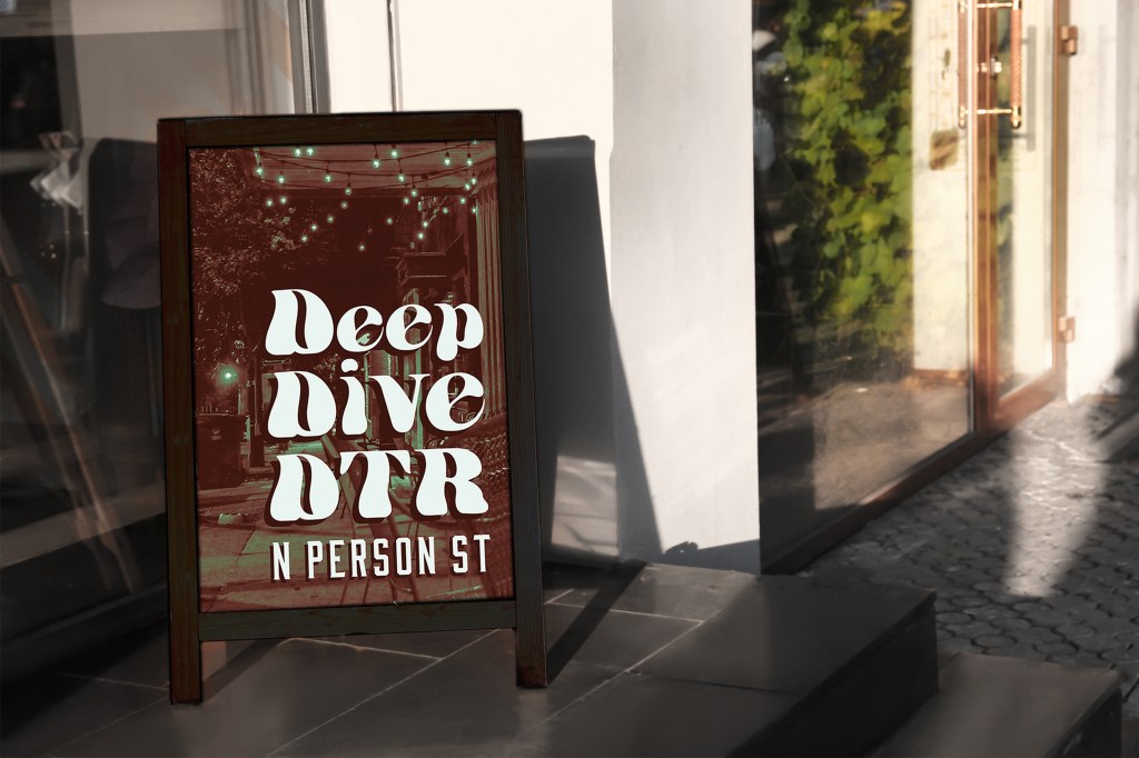 Deep Dive Downtown Raleigh is an advertising campaign focusing on downtown Raleigh, NC locations that are “hidden gems.” It targets Millenials of all gender identities. The campaign’s objective is to increase foot traffic to small businesses in downtown Raleigh. The visual style is inspired by vintage advertisements and features subdued colors that will allow it to integrate with current city branding.