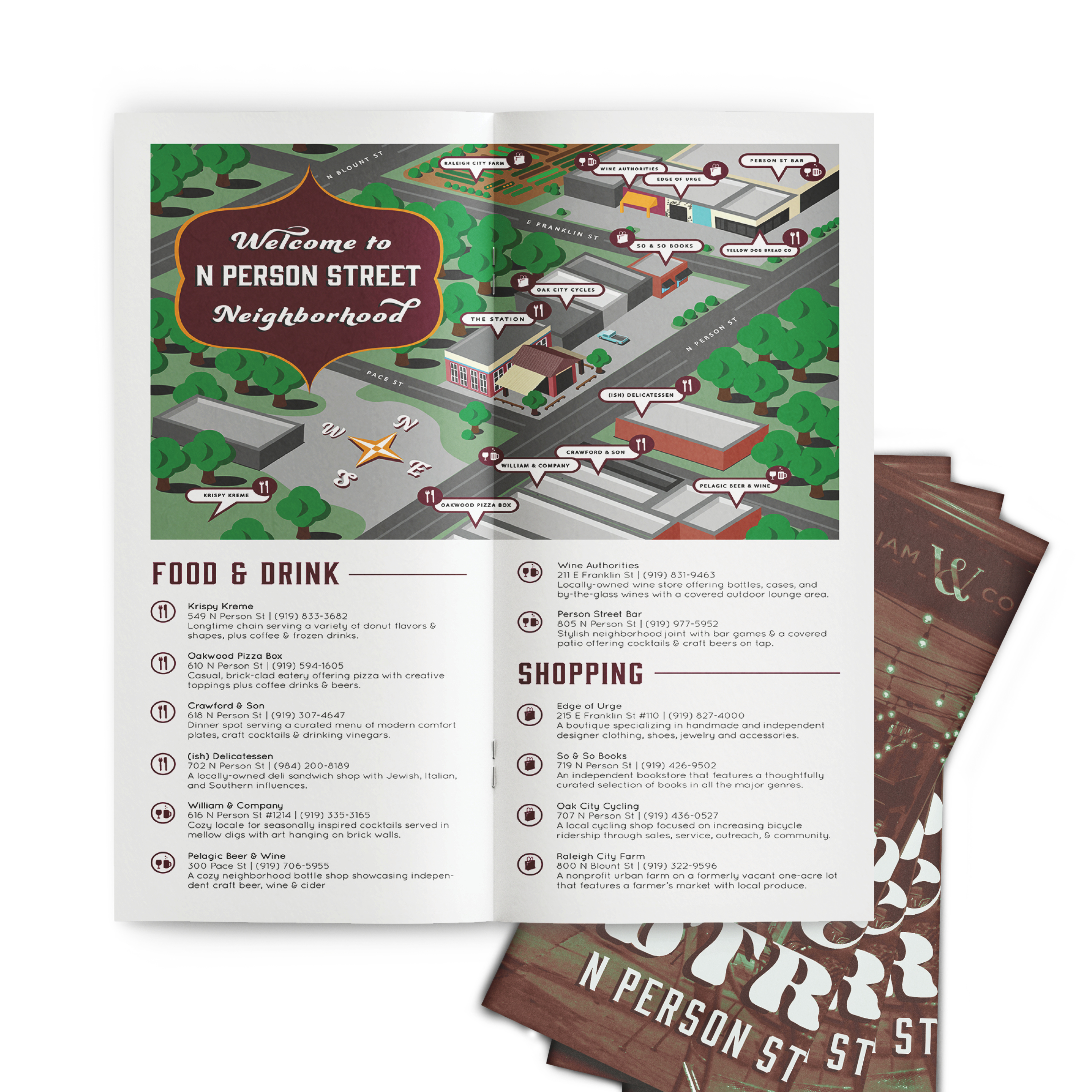 For this project, I created the campaign concept and logo and then began developing the marketing assets. I took photos of downtown Raleigh to create duotone images on the promotional mailer postcards. I drew a digital illustration of the N Person St neighborhood to use for promotional leave-behind brochures. I also created sandwich board signage featuring the campaign title and participating neighborhood names.