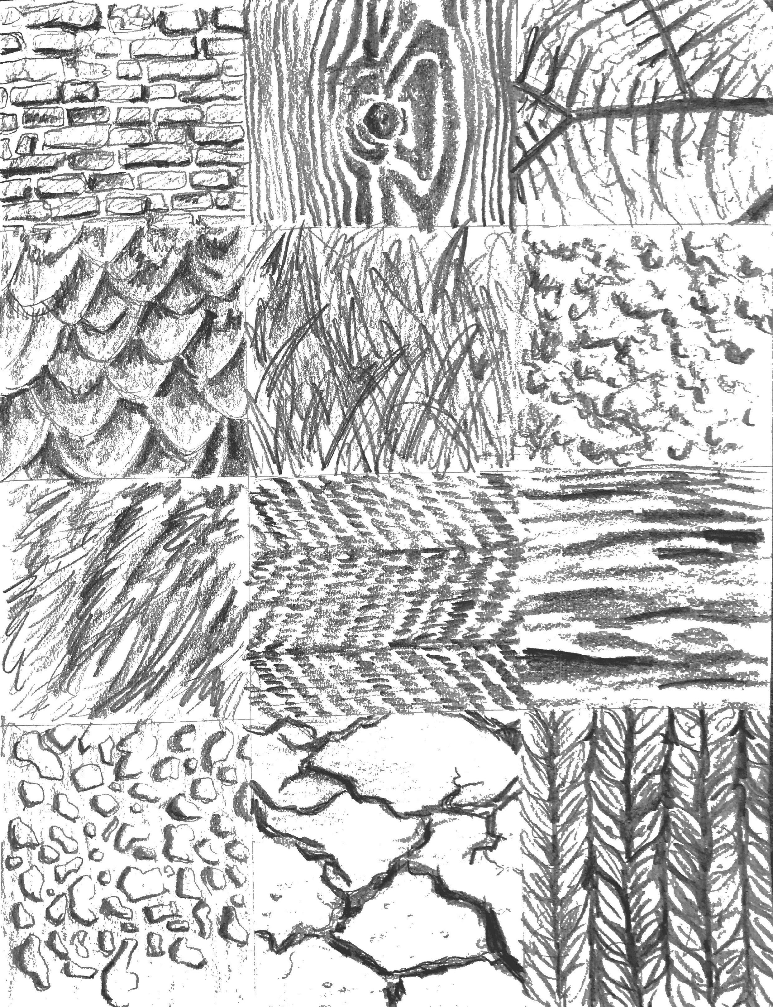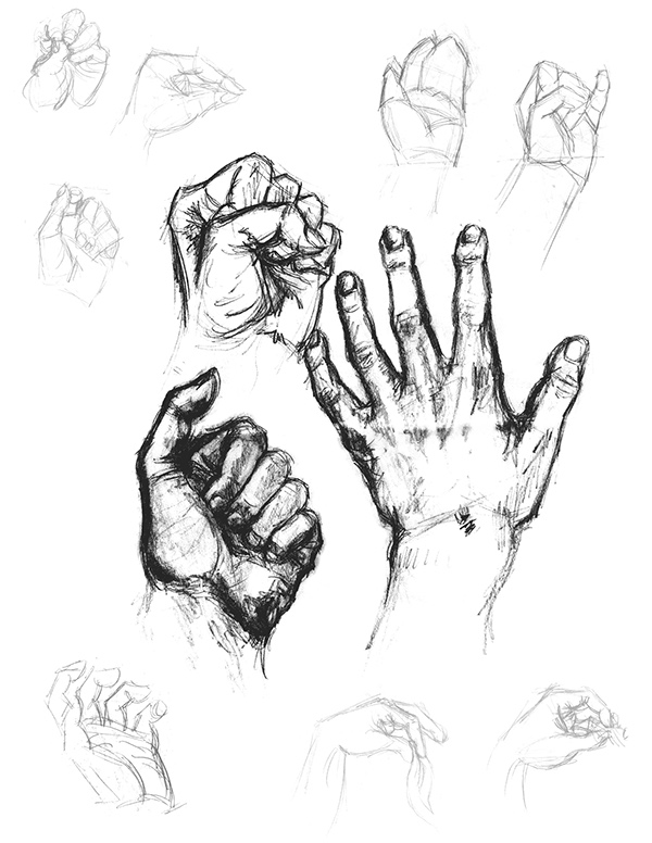 Various studies and sketches. Hands, figures, animals, a still life, and textures. Graphite and charcoal. 2013-2014.