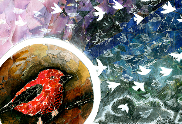 Using this poem as my inspiration, I created sketches of the layout of the piece. I then used torn paper to create the background and the bird.