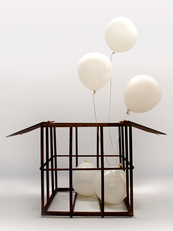This is an interactive sculpture I created to visualize my design thinking process. The wooden cage/box was designed, cut, and assembled by hand, using wood, metal hardware, and other materials. The balloons contained various amounts of helium, causing them to float at different heights. The balloons represented different ideas and their level of success during stages of the design thinking process. The viewer approaches the sculpture with the top closed and latched. The viewer can undo the top latch, allowing the balloons to escape. Pinewood, metal hardware, and mixed materials.
