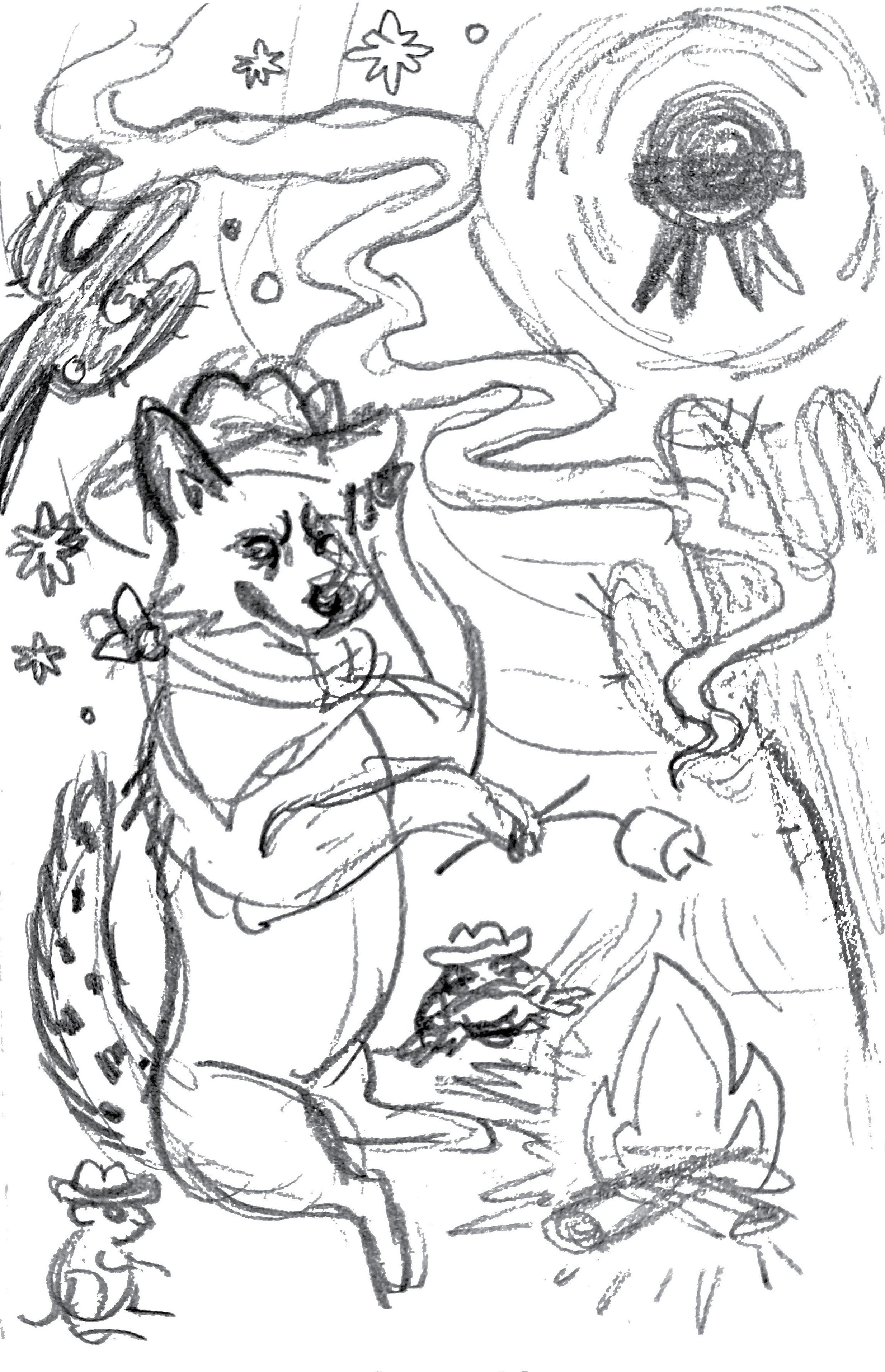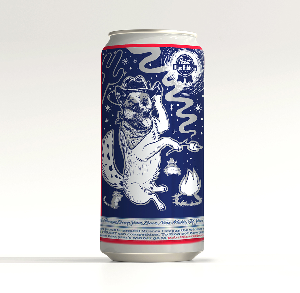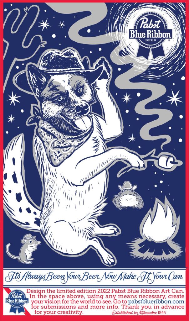 My inspiration behind the piece: “Pabst Blue Ribbon is my favorite beer, my friends always have it waiting for me (with a lime) when I arrive at the bar. When I think of PBR, I think of all the good times I’ve had with my friends while drinking it. This illustration shows three animal friends camping in the desert. The Australian Cattle Dog (Red Heeler) is based on my own dog, Jolene. The gerbil in the bottom left is based on my two gerbils, Thelma and Louise. The toad is not a pet of mine but was chosen because toads are pretty darn cool. I hope you enjoy my illustration and have yourself a root-‘tootin time while drinking Pabst Blue Ribbon. Yeehaw!”
