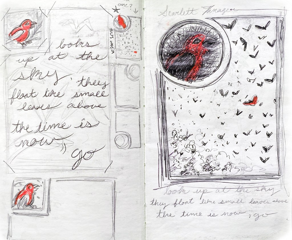 The red bird is a Scarlet Tanager, which can be found on the East Coast of the United States. I wrote a haiku about the piece during the preliminary stages. It reads,