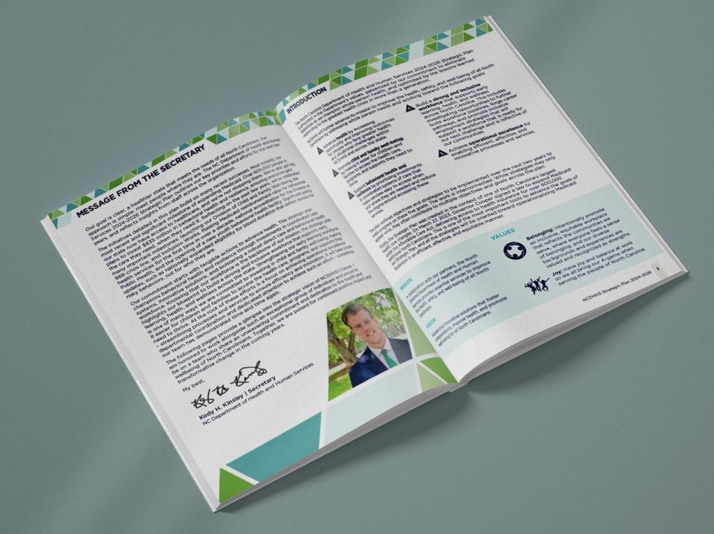 The North Carolina Department of Health and Human Services 2024-2026 Strategic Plan is grounded in the Department’s values, galvanized by our commitment to eliminate disparities as we champion whole-person health, and optimized by the lessons learned responding to the most significant health crisis in more than a generation.