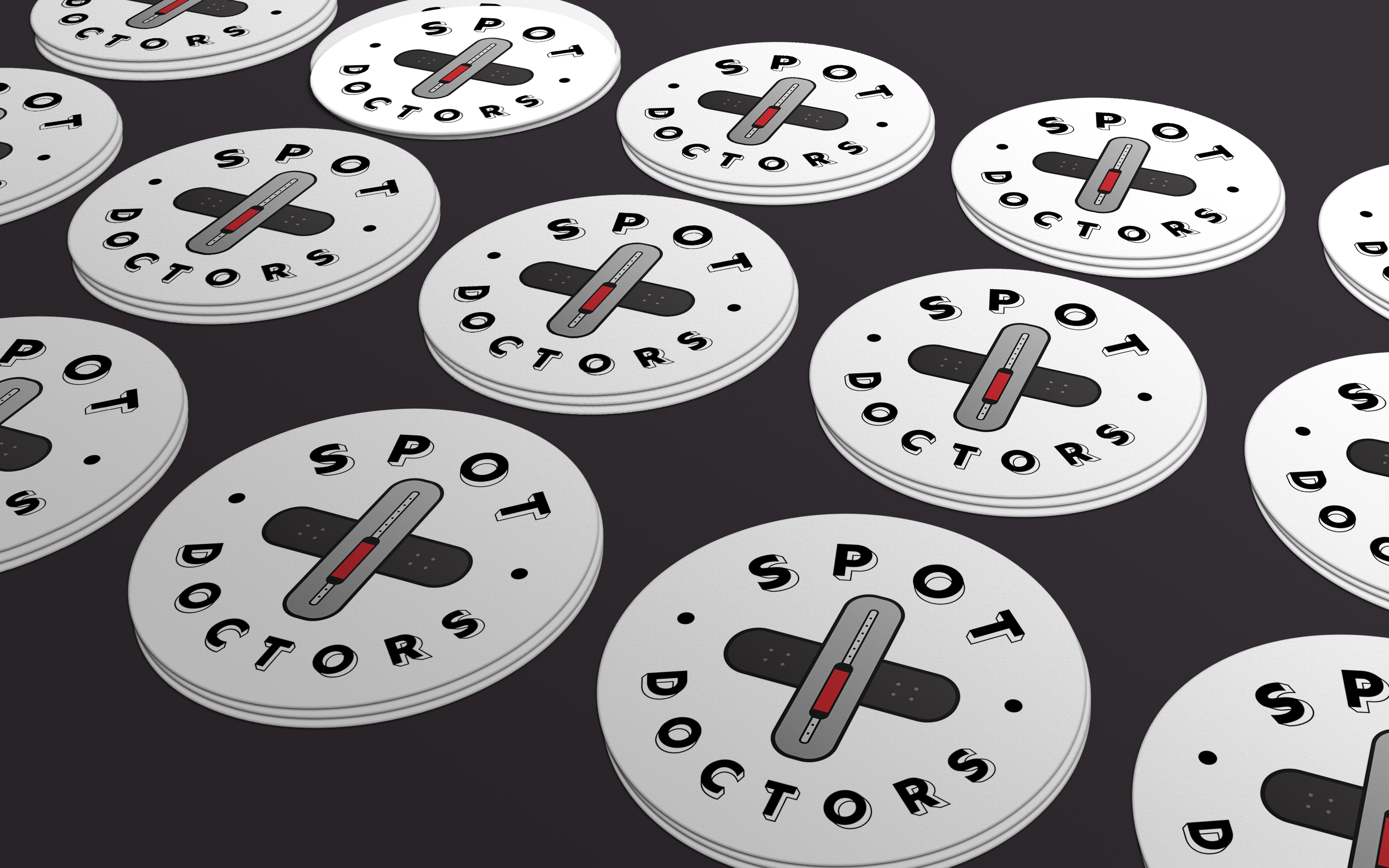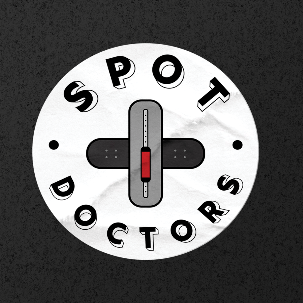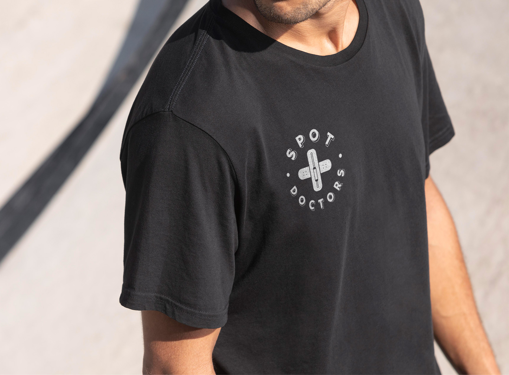 By the end of the project, I not only created a logo for the Spot Doctors but designed several other items as well. I created skate deck graphics using the cross iconography from the logo, an enamel pin design, and a t-shirt design. I also created a product packaging design and photographs of the product prototype in use. I also had logo stickers made, which Jed and his friends are placing around Raleigh, NC. (Keep an eye out for them in the wild!)