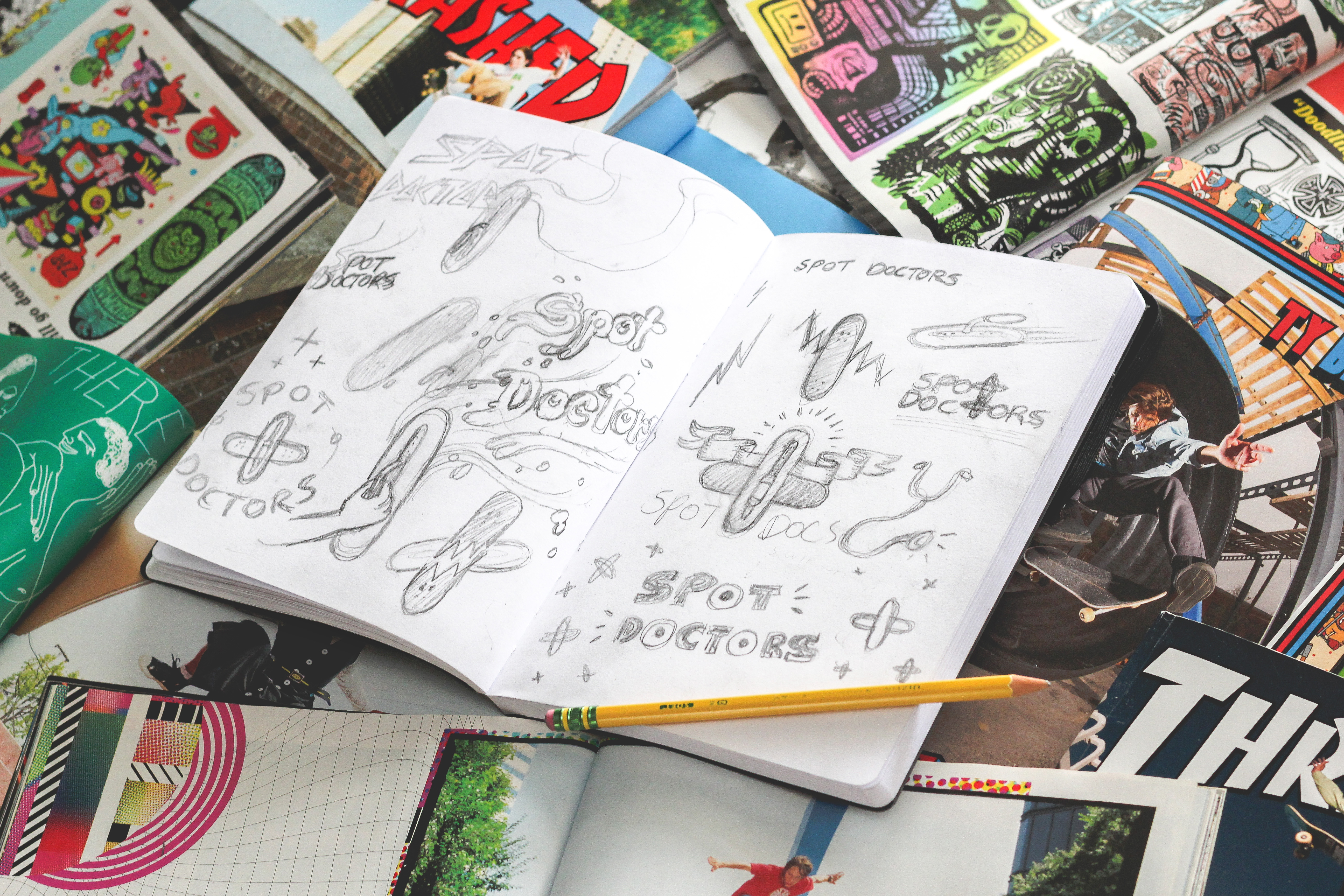 During my initial research, I sifted through countless skateboarding magazines and looked at current skate company logos and branding. I sketched several different logo concepts using a concrete trowel and skate deck. With Jed’s feedback, I further developed one concept into the final logo.